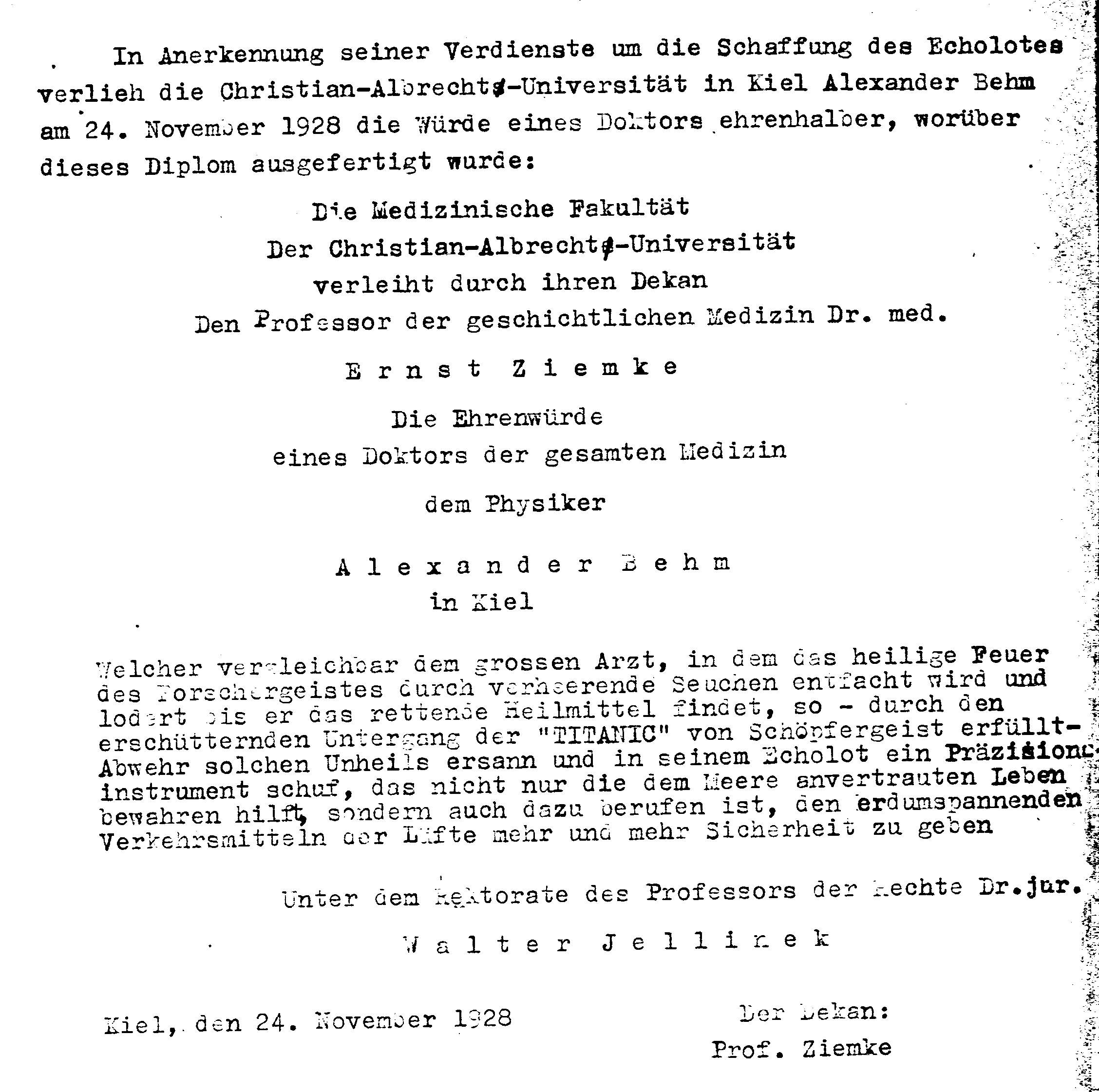 1928 Urkunde zur Verleihung der "Ehrenwürde eines Doktors der gesamten Medizin" durch die Universität Kiel (Auszug aus Abschrift, Fundstelle: Stadtarchiv Kiel, Foto: W. Schneider)
